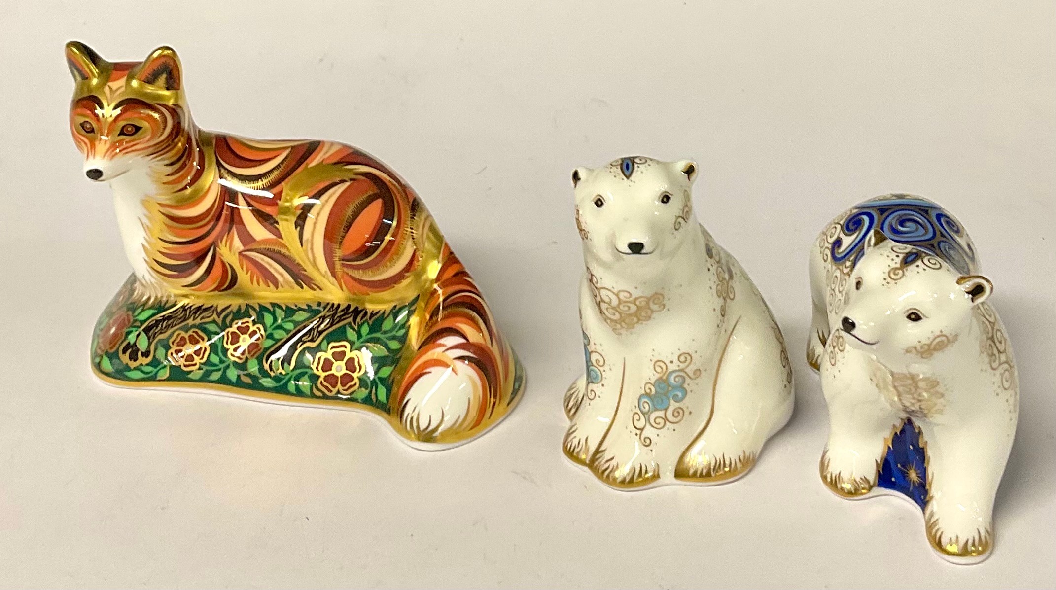 A pair of Royal Crown Derby paperweights, Polar Bear Cub Standing and Polar Bear Cub Sitting, silver stopper, the standing bear 11cm long, printed marks; another, Fox Cub, silver stopper, 8.5cm high, printed mark (3)