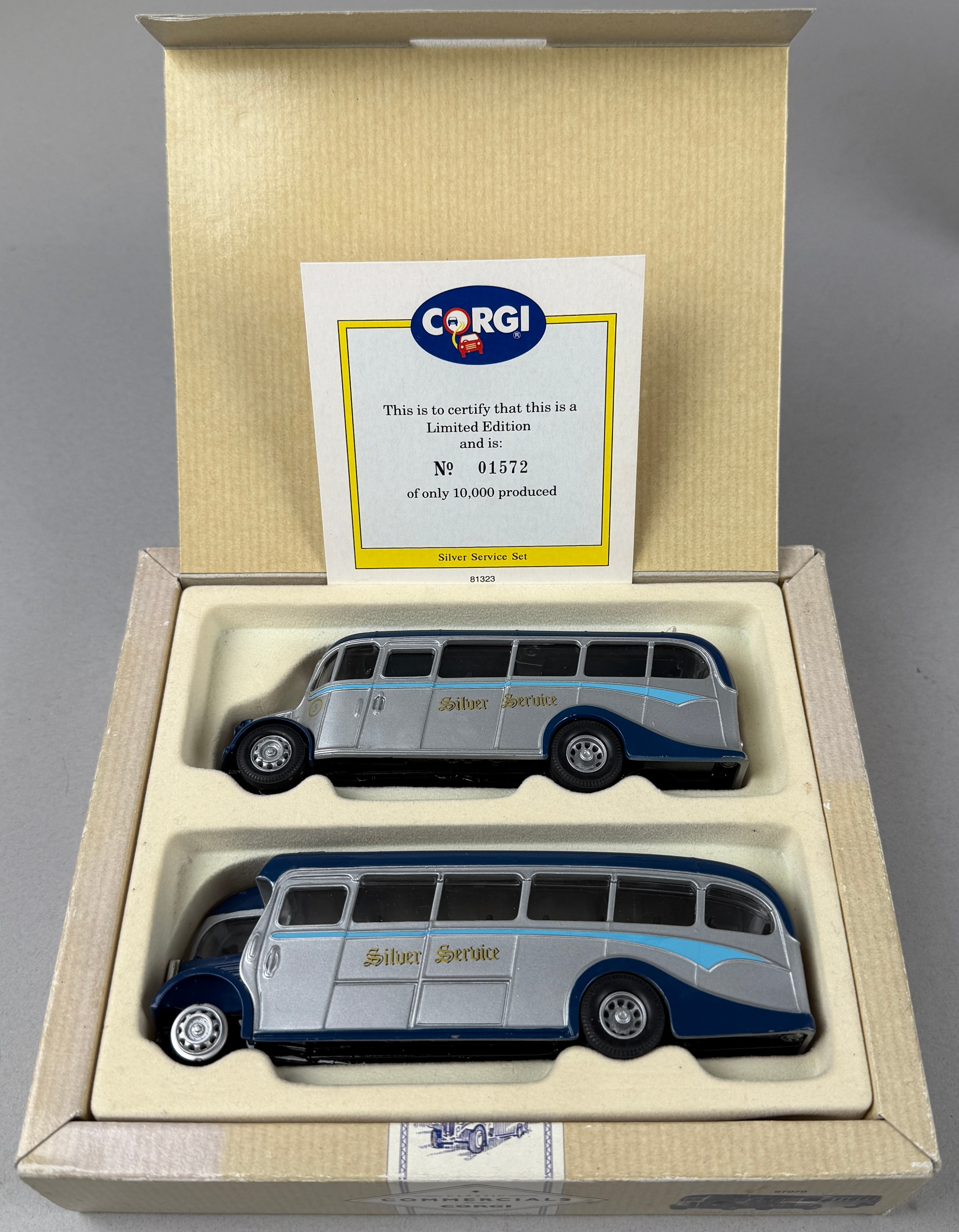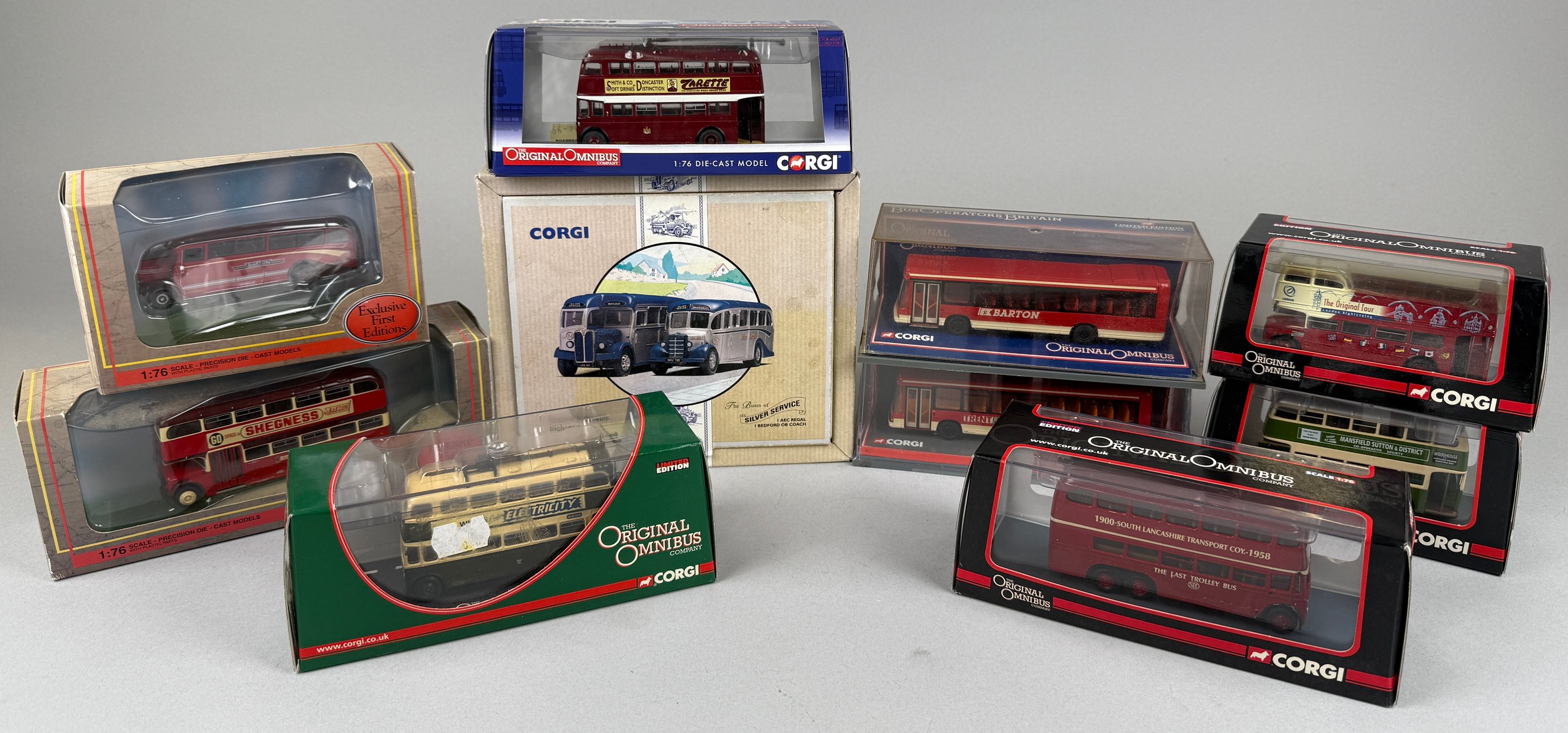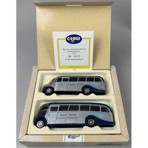 Corgi Toys - The Buses of Silver Service, AEC Regal and Bedford OB Coach, limited edition 1572/10000, boxed; The Original Omnibus Company, OM43708 Sunbeam S7 3 Axle Trolley Bus South Lanes, limited edition 768/1200, boxed; 42904 Optare Delta Trent, limited edition 1548/4600, boxed and sealed, etc; Gilbow, exclusive first editions, 30706 AEC Renown Bus Barton Transport, boxed; 26807 Leyland Duple Coach Barton Transport (10)