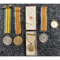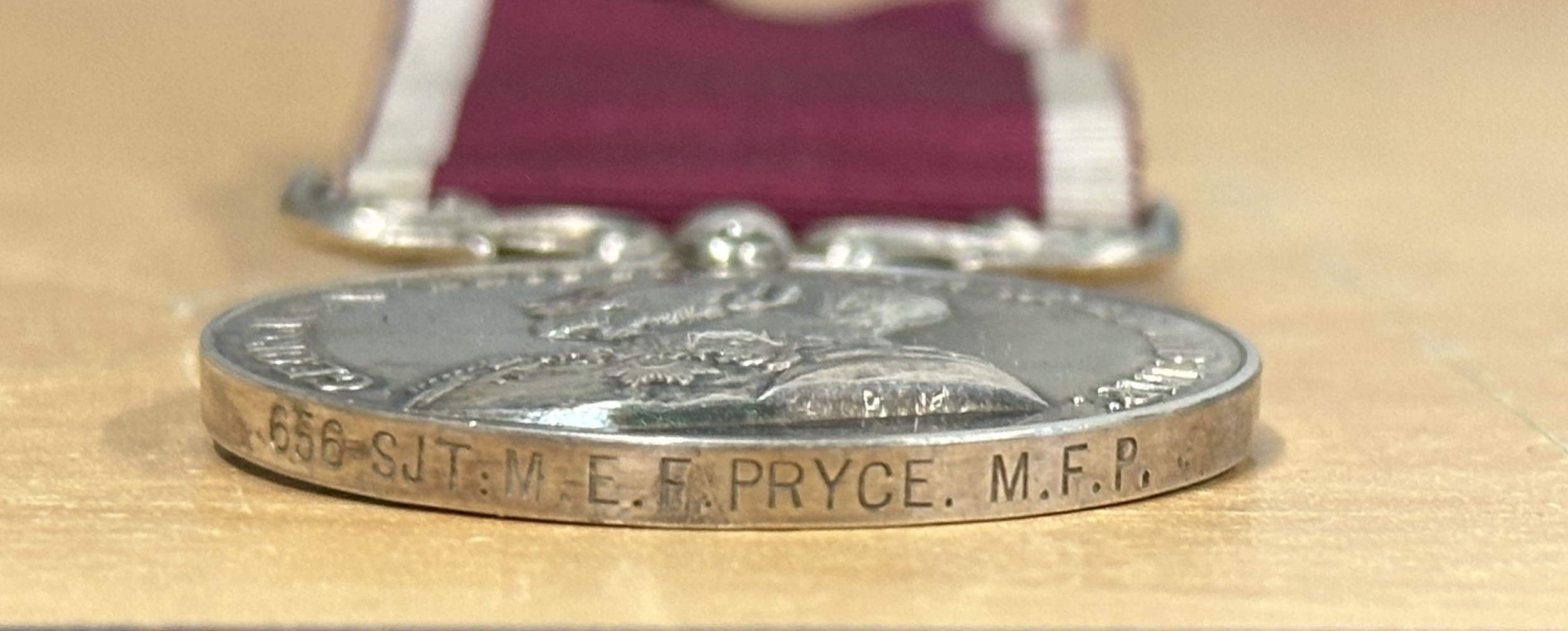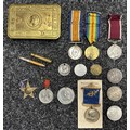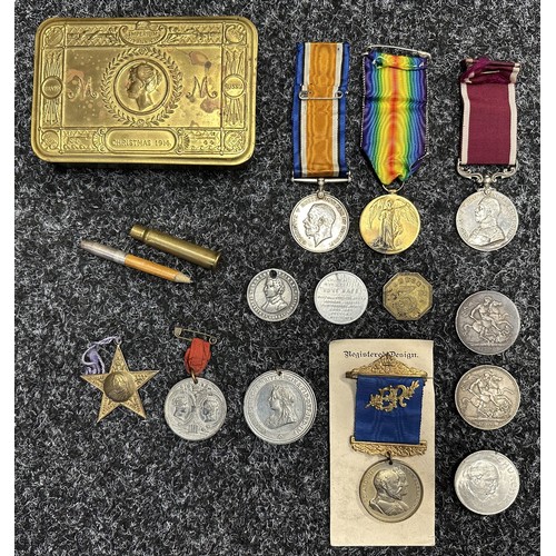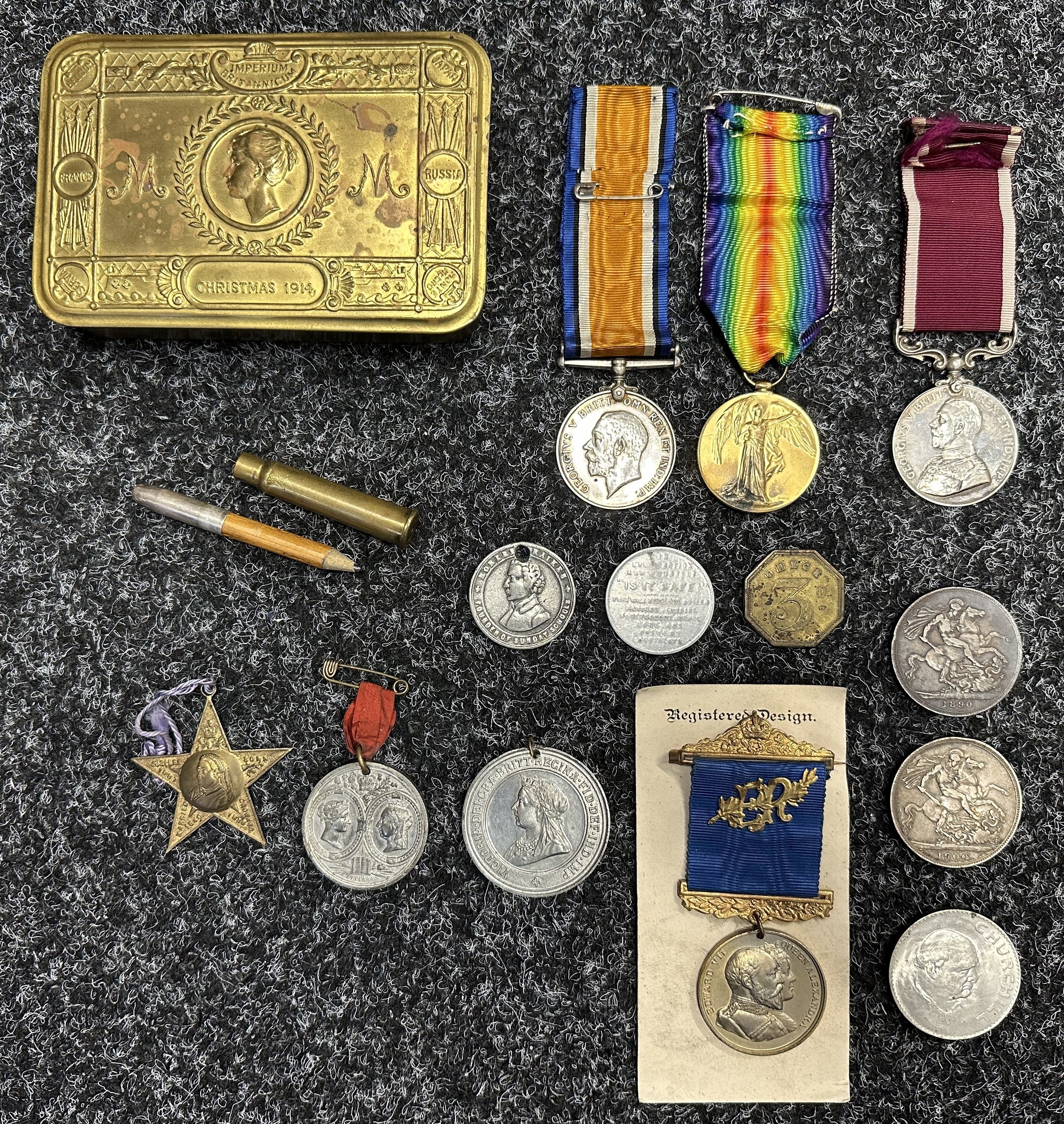 WW1 British Princess Mary's Gift Tin Christmas 1914 along with Bullet Pencil, War Medal and Victory Medal to 172438 Dvr. WH Lewis, Royal Engineers complete with original ribbons: Long Service and Good Conduct Medal to 656 Sjt MEF Pryce, MFP, complete with ribbon. Along with various medallions and coins including two Victorian Silver Crowns, 1890 and 1900.