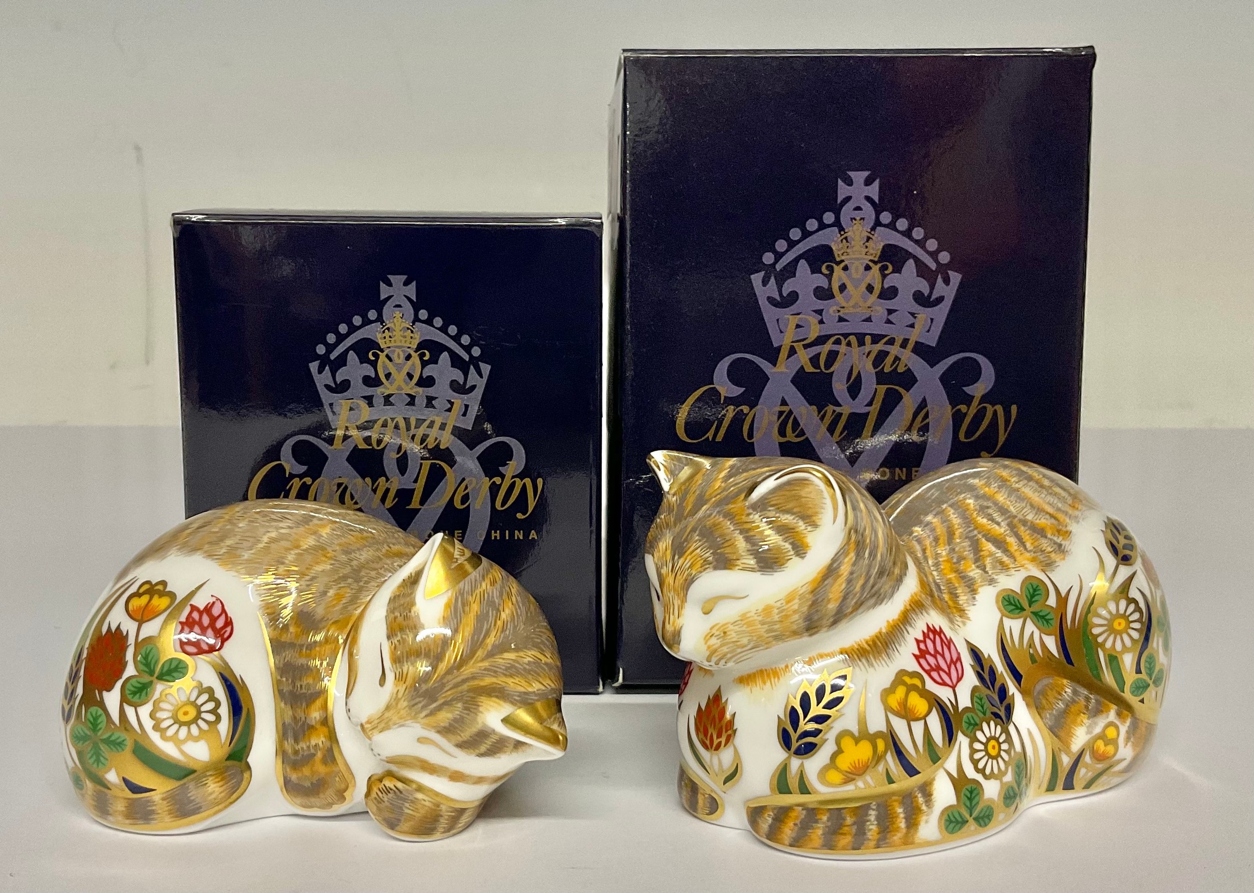 A pair of Royal Crown Derby paperweights, Cottage Garden Cat and Cottage Garden Kitten, gold stoppers, the mother 11cm long, printed marks in red, each boxed (2)