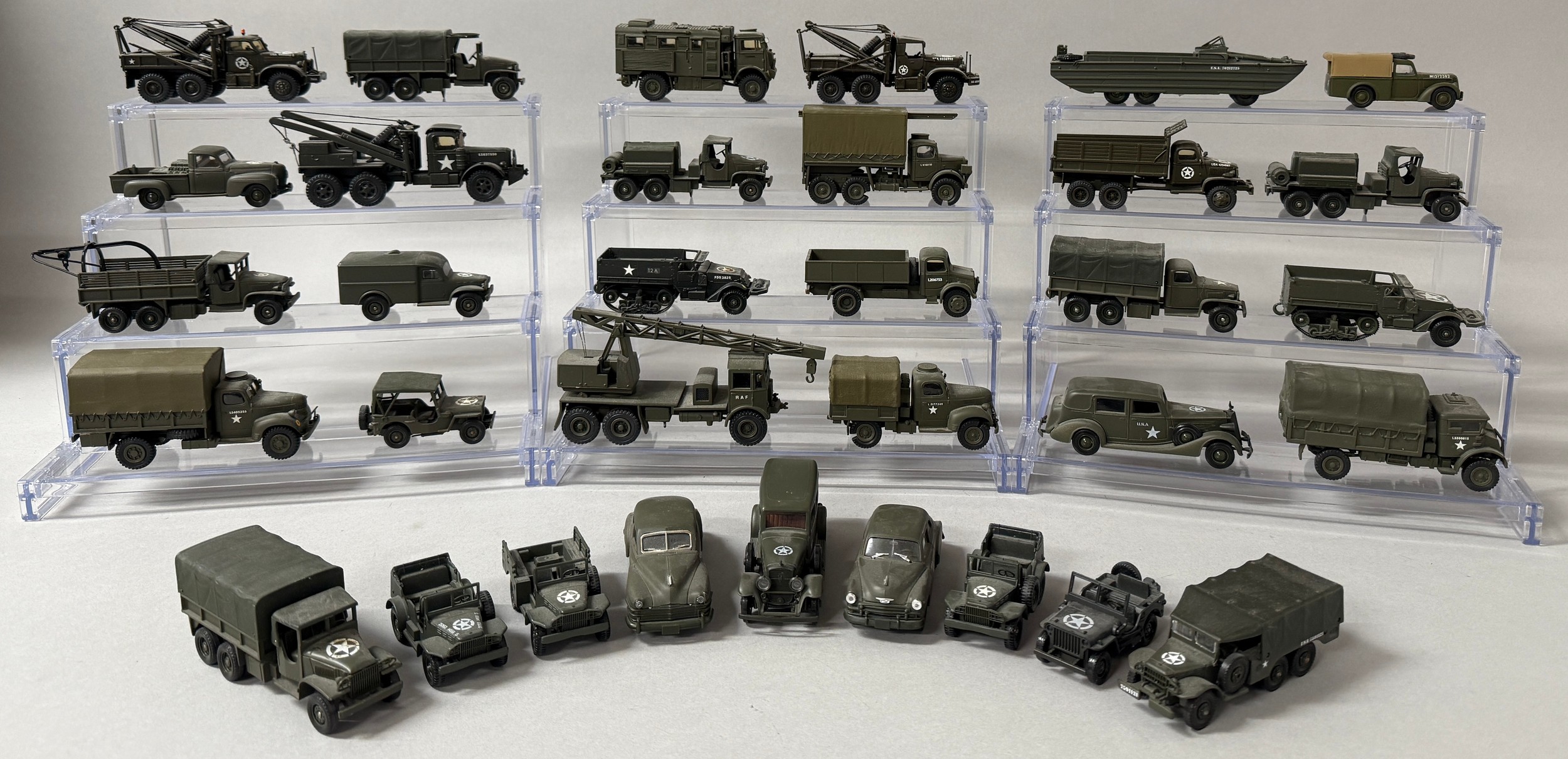 Model Military Vehicles - Matchbox Dinky, Commer 8 CWT Van 1948; Solido, 242 Dodge 6x6, Half Track M3, GMC, Dodge 4x4, Cadillac V16, Jeep Willys, Packard, etc; Hart Models, Verem, etc, all army green (33)
