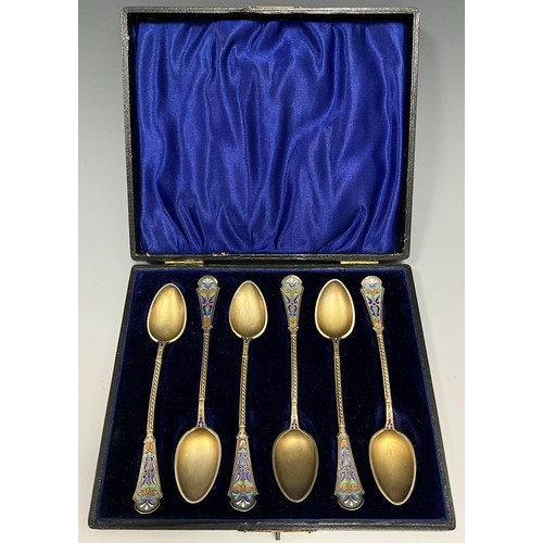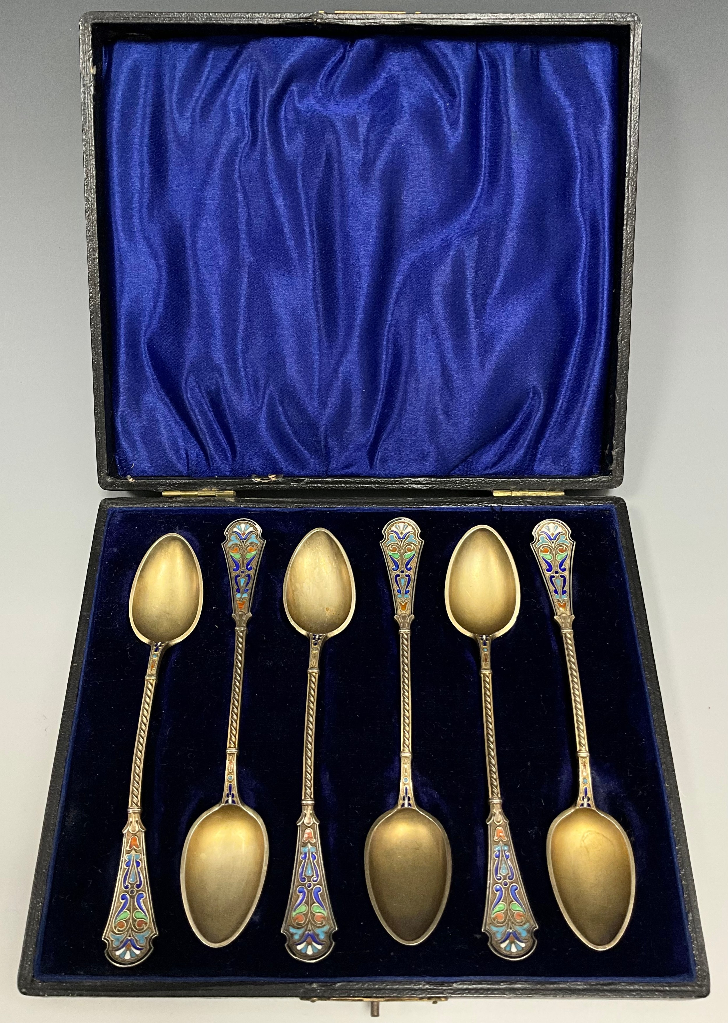 A set of Six David Anderson enamelled silver tea spoons, 68.55 grams, (cased).