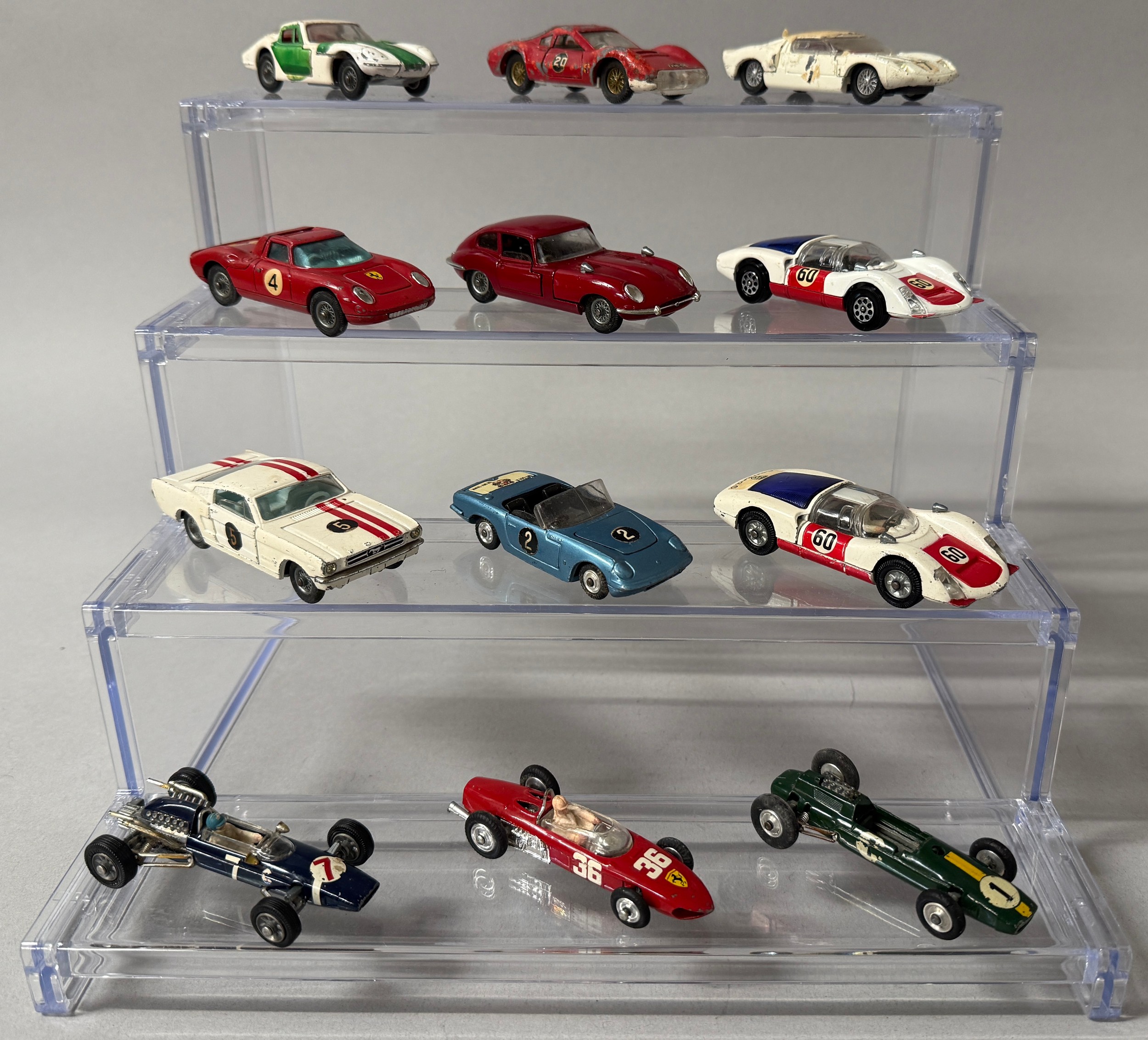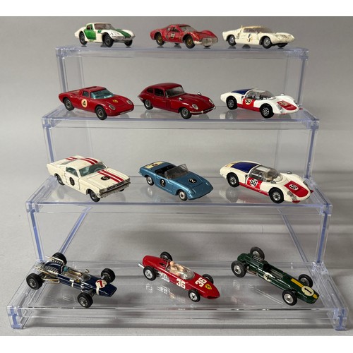 Corgi Toys - 155 Lotus-Climax Formula 1, green body with yellow stripe, '1' decal to bonnet and doors, spun hubs; 156 Cooper-Maserati Formula 1, blue body, '7' decal to bonnet and doors, spun hubs; 154 Ferrari Formula 1, red body, '36' decal' to bonnet and doors, spun hubs; 335 Jaguar 'E' Type '2+2', red body, black interior, cast hubs; 325 Ford Mustang Fastback 2+2, white body with double red stripe, '5' decal to bonnet and doors, blue interior, cast hubs; others Carrera 6, Whizzwheels Porsche Carrera 6, Ferrari Berlinetta 250 Le Mans, etc; Dinky Toys - Dino Ferrari, all playworn (qty)