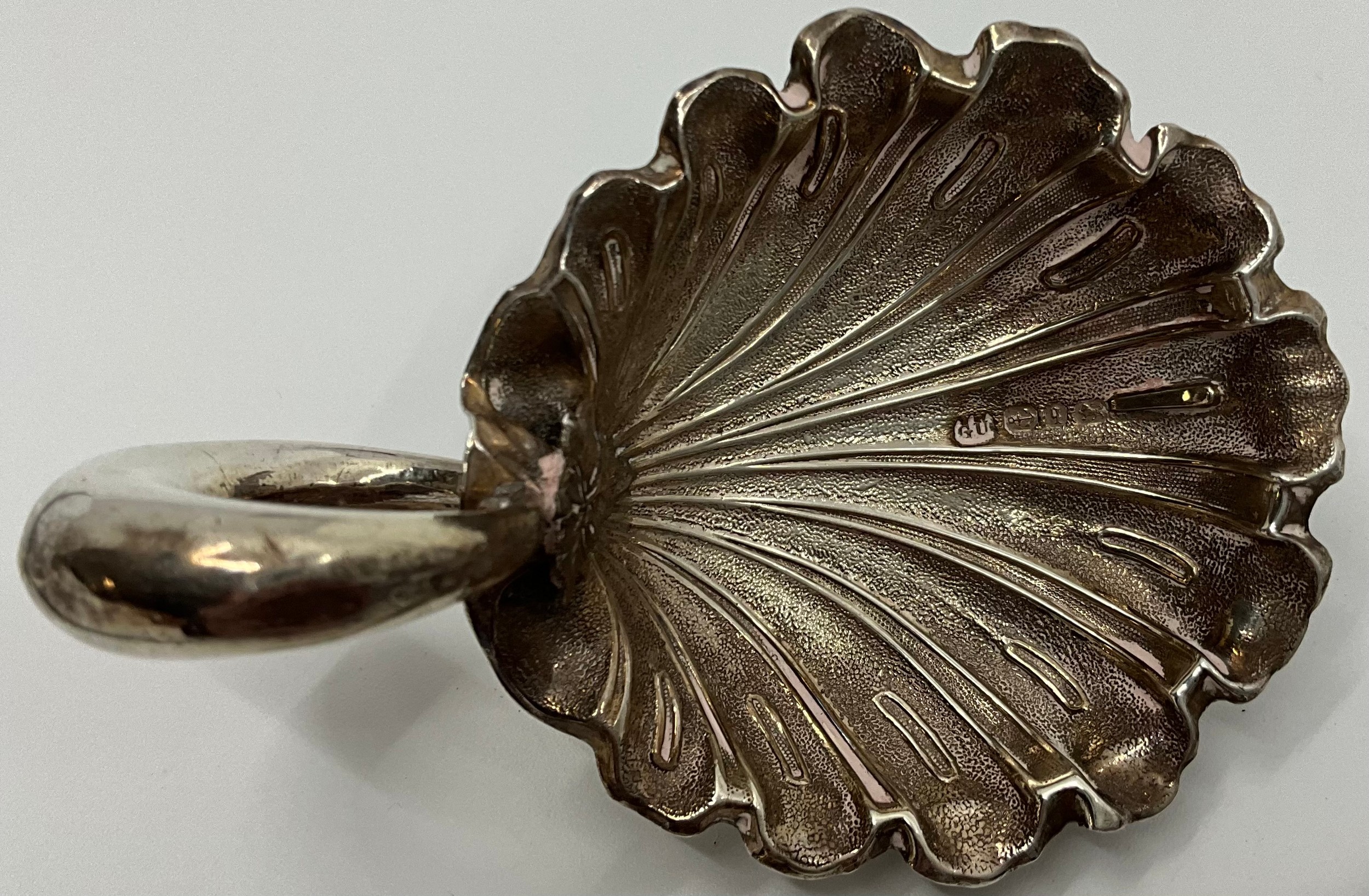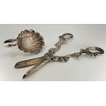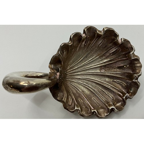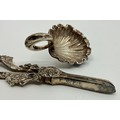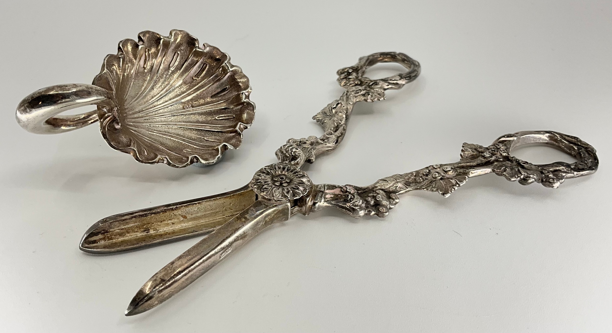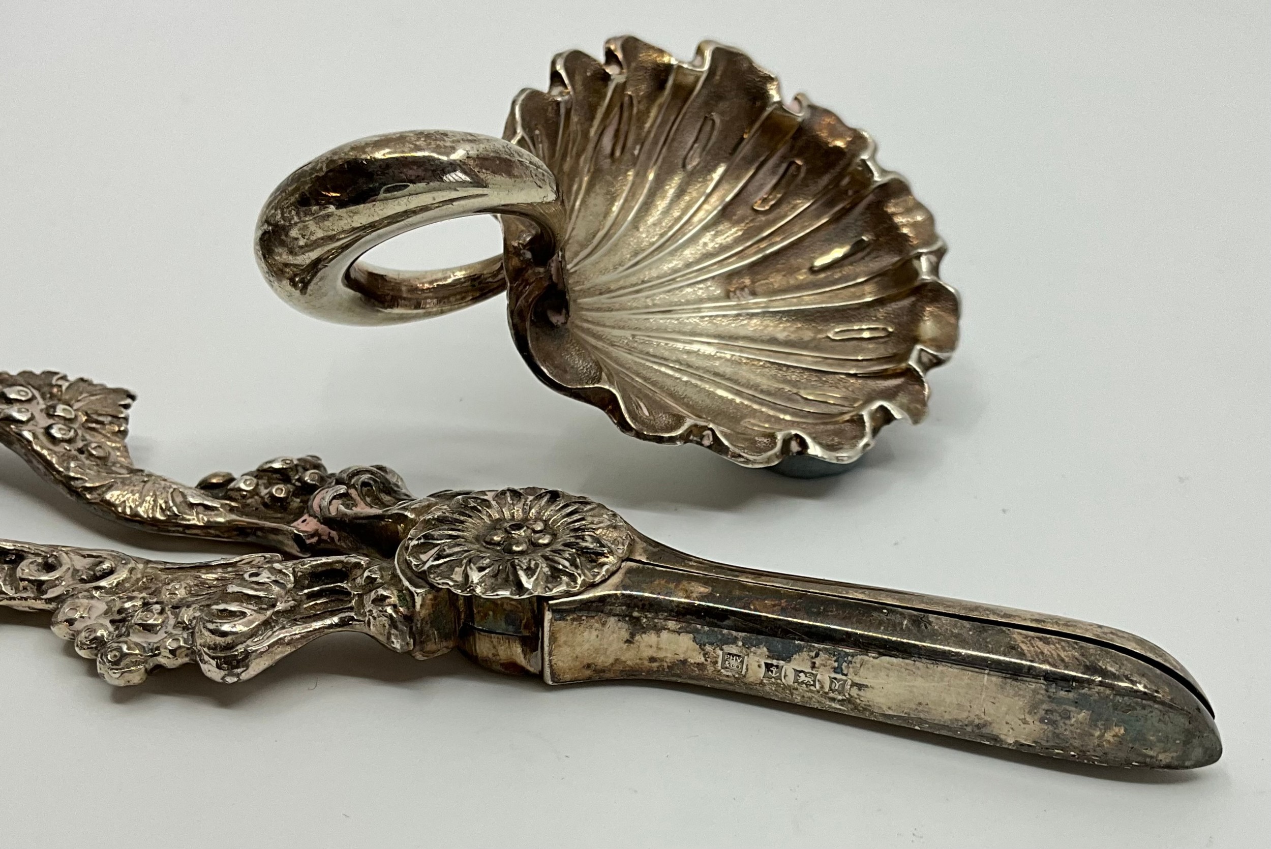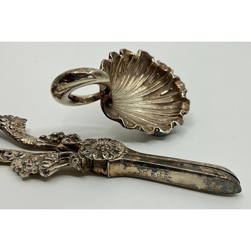 A pair of Elizabeth II silver grape scissors, P H Vogel & Co, Birmingham 1973; Victorian silver shell bowl caddy spoon, George Unite & Sons, Birmingham 1890, 128.2g (2)